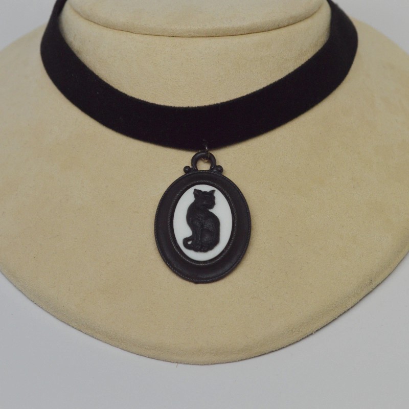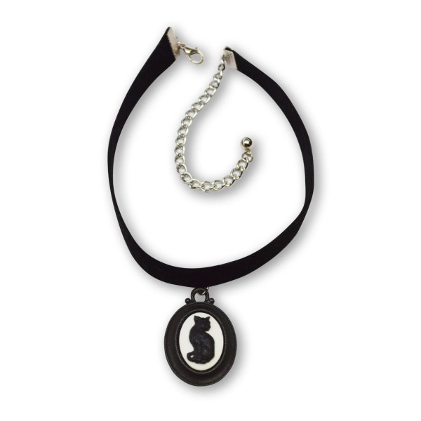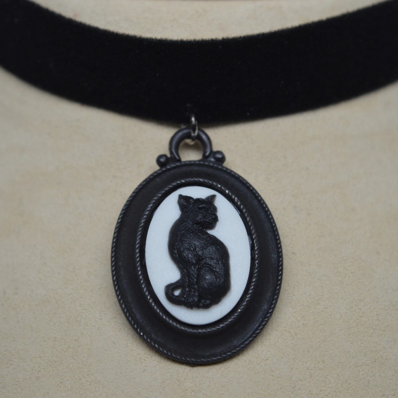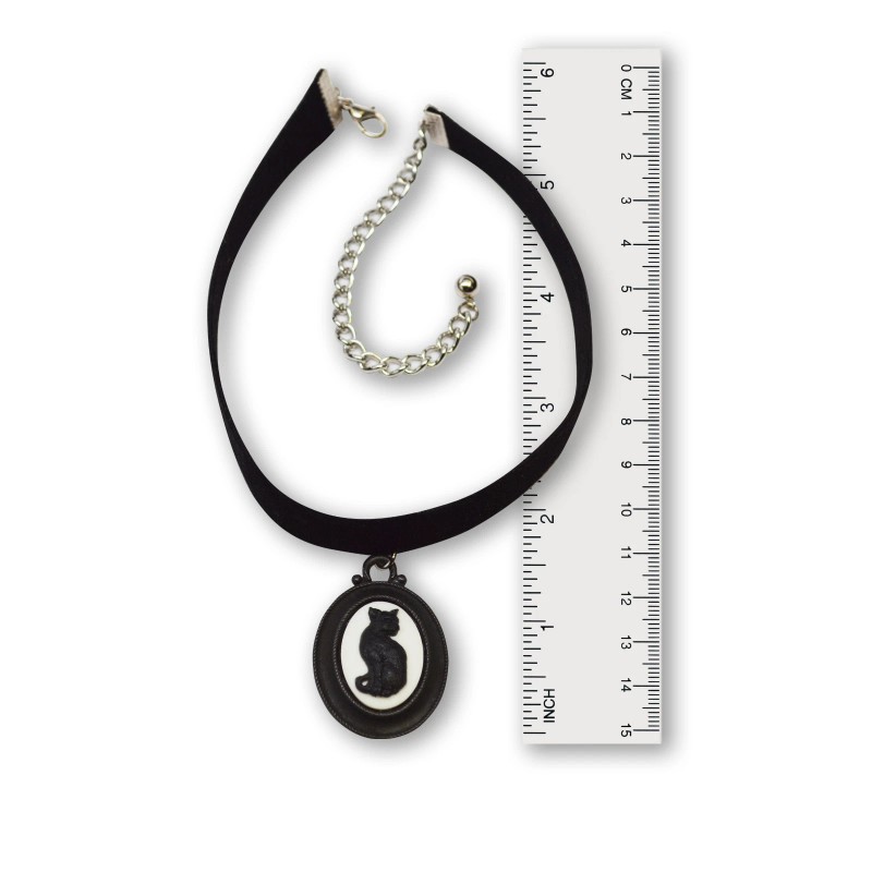 Real Metal Black Velvet Choker with Gothic Black Cat Cameo Adjustable Size CH-652