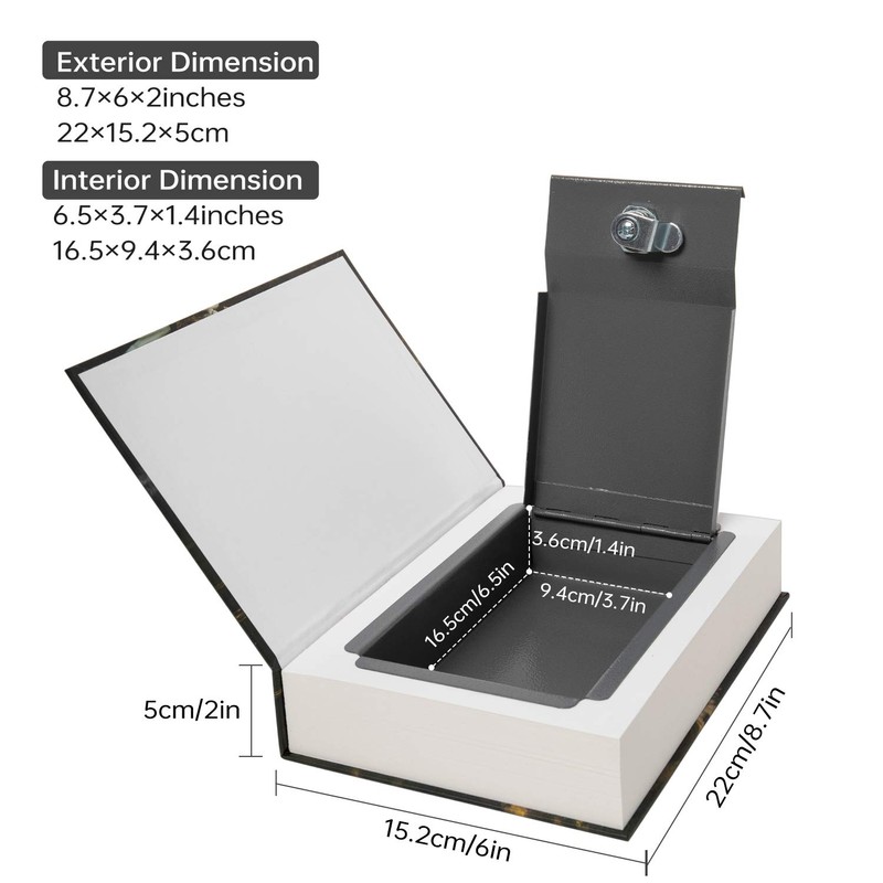 • Internal storage area size: 1.4x3.7 x 6.5 inches, full book size: 2 x 6 x8.7 inches