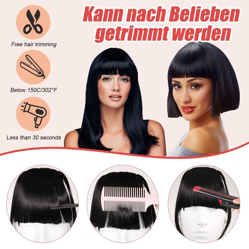 - Product size and material: pony size: the shorter part (middle) is 6 inches long, the sides are 9 inches long, the fringe weighs 30 grams, with 2 clips. Made of heat resistant synthetic fibres. It is thick and neat, 15 cm long in the middle and 20 cm long at the temples. Fringe can be cut to any length or volume to suit your face shape and hairstyle. It is cheap and easy to use and gives you more possibilities and fun to experim with different hairstyles