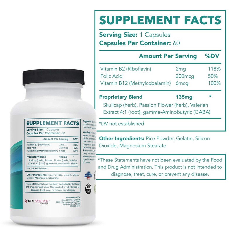 Vitamin B2 (Riboflavin) 2mg, Folic Acid 200mcg, Vitamin B12 6mcg, Skullcap (herb), Passion Flower (herb), Valerian Extract 4:1 (root), gamma-Aminobutyric (GABA)