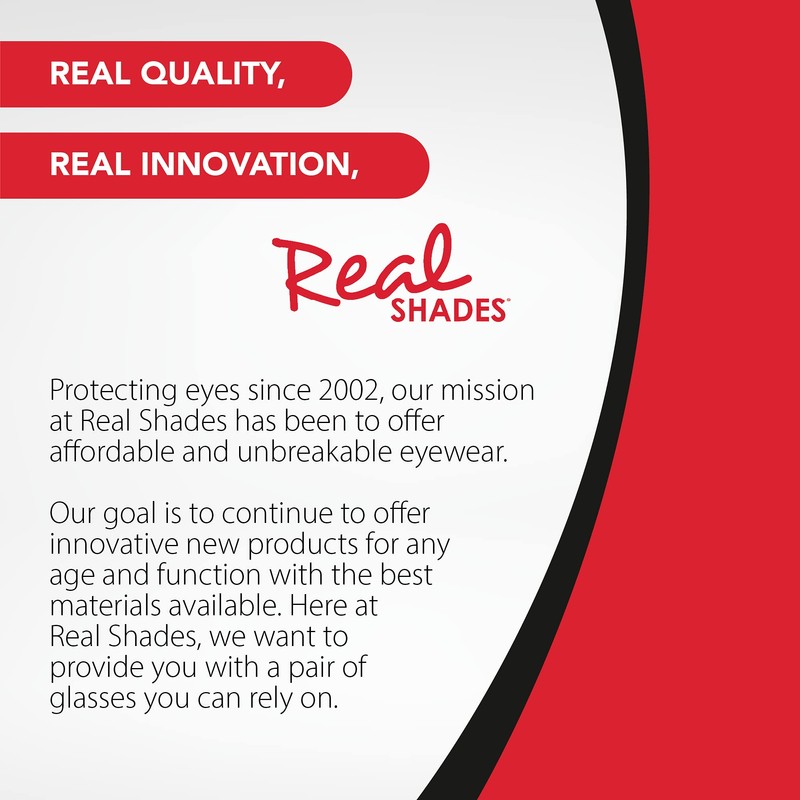 - THE REAL SHADES MISSION: Since 2002, we’ve made it our mission to protect as many eyes as possible from the damaging effects of UV radiation by specializing in stylish, fun sunglasses with unbreakable frames and ophthalmic-quality lenses.