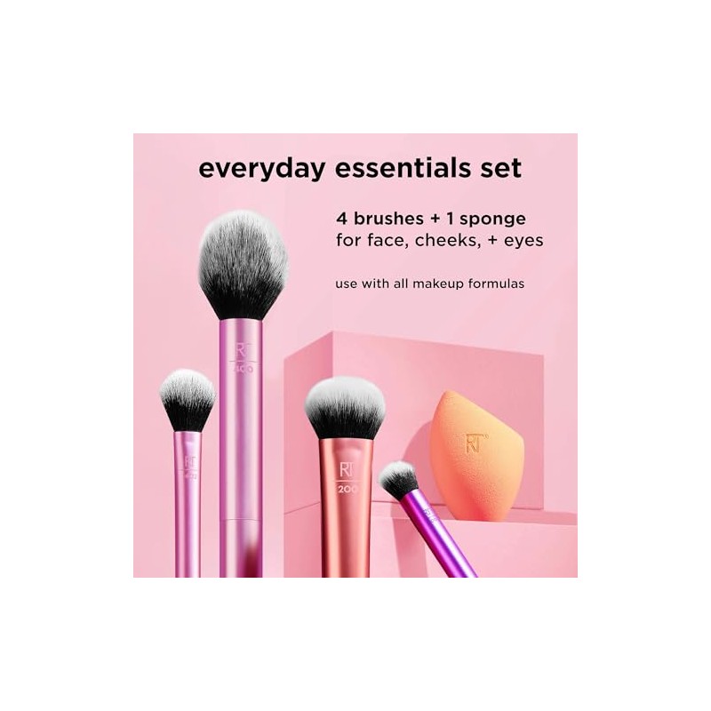 🌟 ⭐ Real Techniques, Everyday Essentials, Set de Brochas de Maquillaje con Esponja Multifuncional, Kit de Accesorios Esenciales, Juego de Brochas para Maquillar Ojos, Mejillas y Rostro, 5 piezas ⭐ 🌟