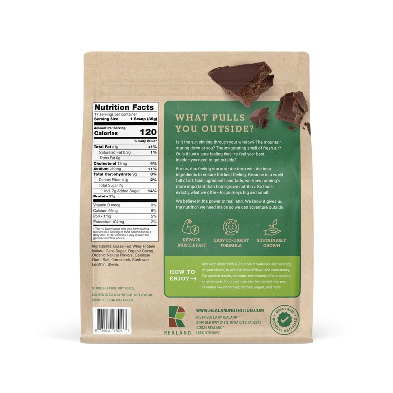 - REALAND RECOVERY PROTEIN: Experience the deliciously pure form of recovery with Realand - Recovery. Grass-Fed Whey Protein Isolate in Chocolate. Each serving delivers a robust 22 grams of protein, supporting your muscles with the highest quality fuel needed for recovery and growth, enhanced with the rich, authentic taste of organic cocoa.