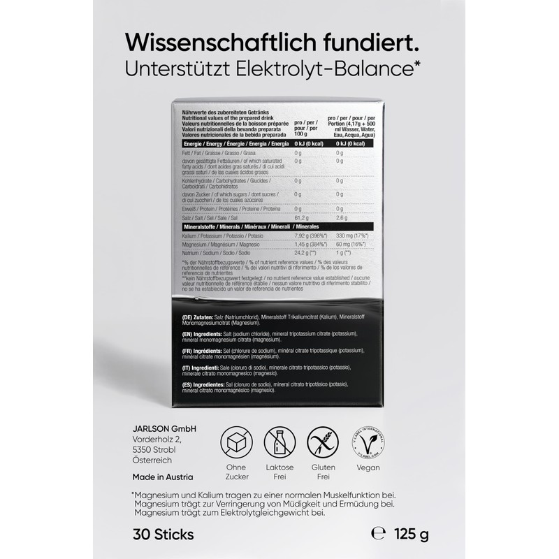 - Real, clean and transparent – only 6 selected ingredients: 3 minerals for your electrolyte balance. 3 ingredients for natural flavour. No sugar. No fillers. No dyes. No artificial flavors. Only tested quality from Austria and Germany.