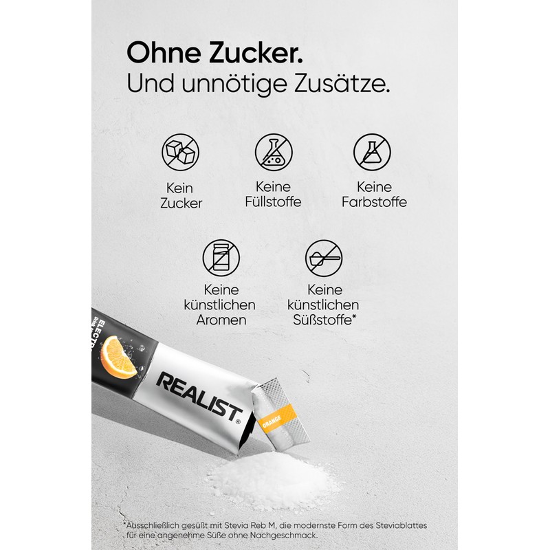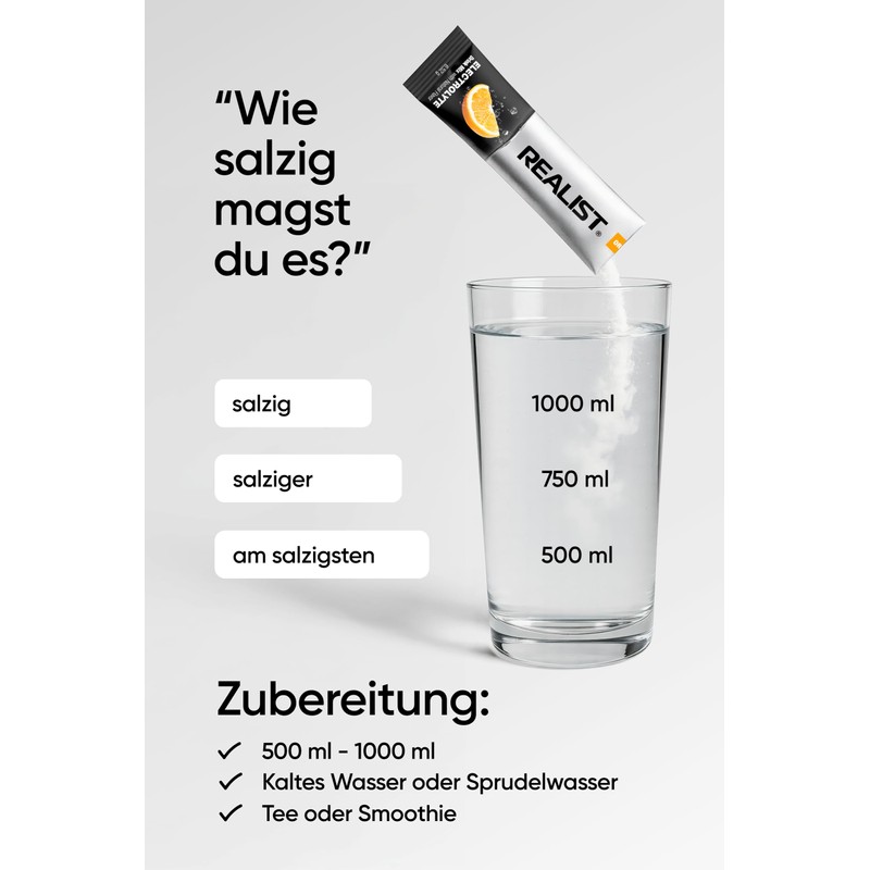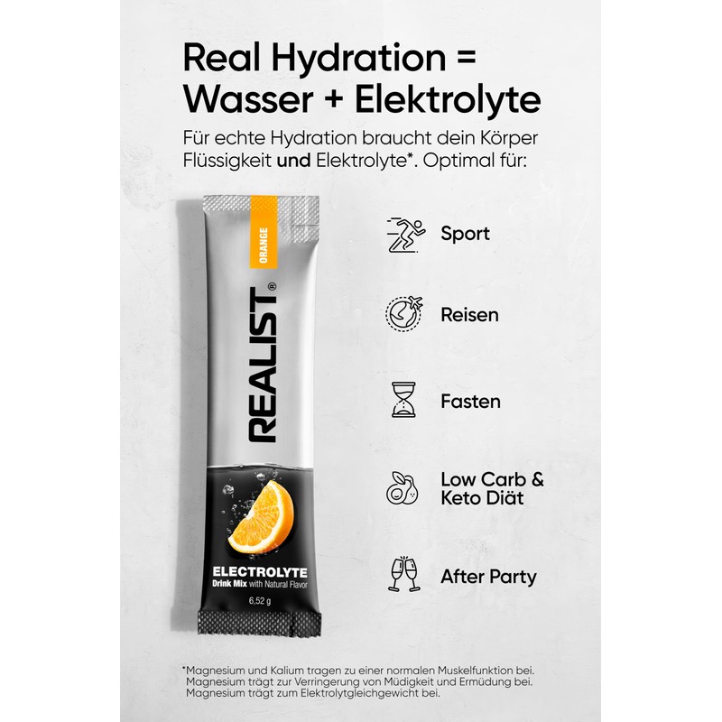 - Made for your lifestyle: whether sports, fasting, keto, low carb, travel or long nights – REALIST complements your routine with important electrolytes such as potassium and magnesium, which contributes to normal muscle function and reduce fatigue. Thanks to the practical individual portions in stick format, you always have your electrolytes with you - perfect for on the go, in everyday life or when travelling.