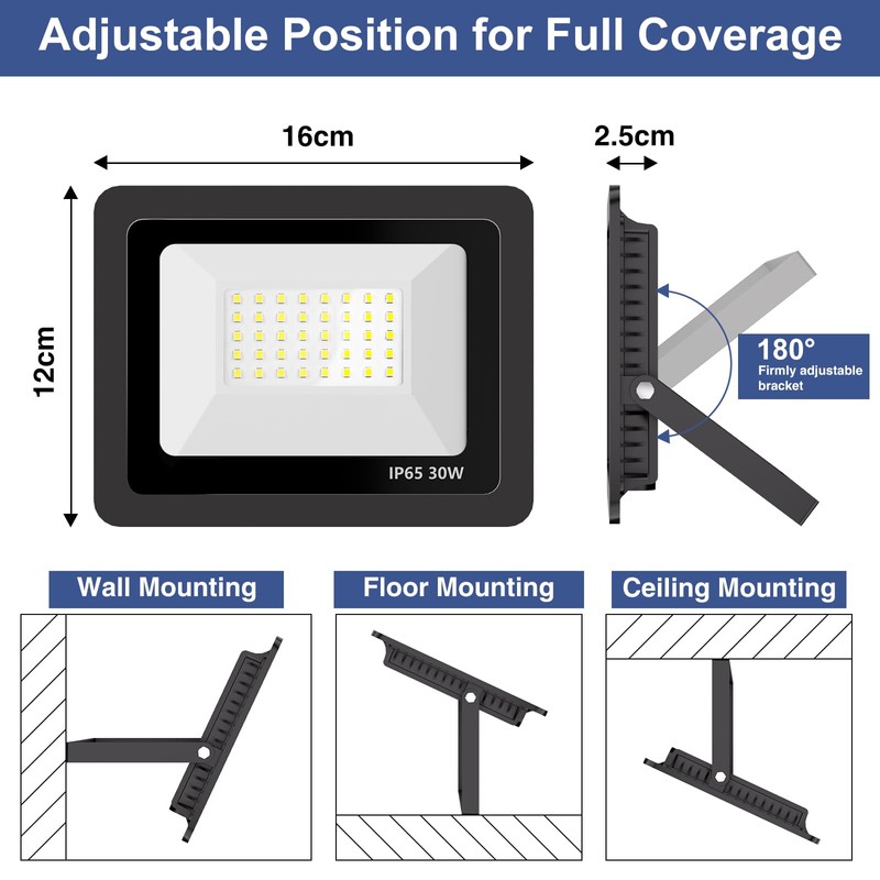 • Easy to install: the thick metal bracket makes the LED floodlight more stable. Each LED outdoor light is equipped with a 50 cm long, high-quality rubber cable and a 355° adjustable bracket, making installation more convenient and not restricted by space and location. Wide lighting range and high brightness, suitable for any occasion! (The package does not contain screws)
