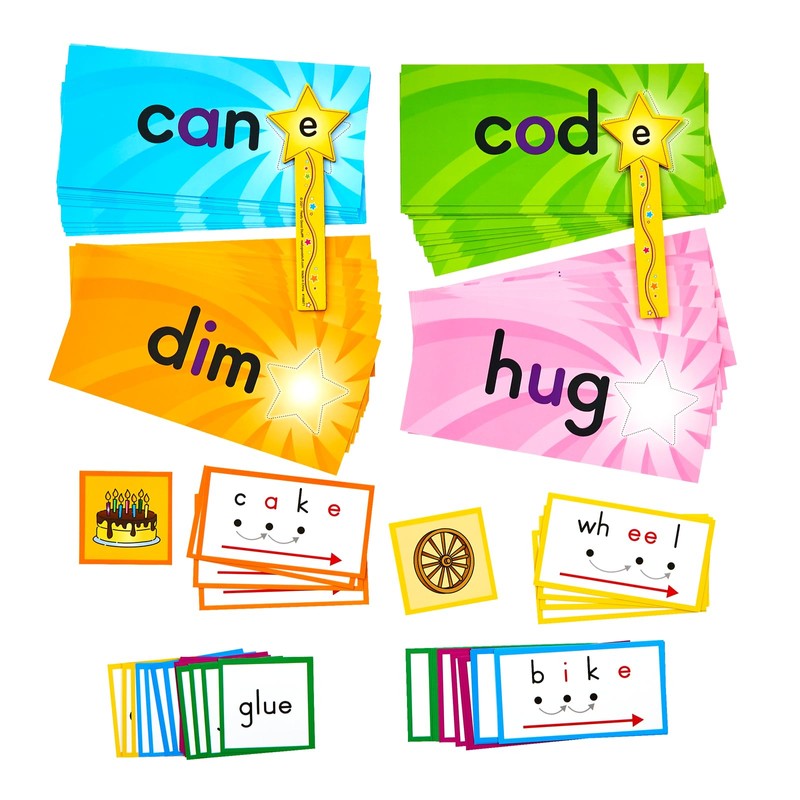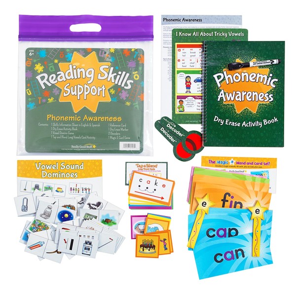 - WHAT YOU GET: 1 Skills Information Sheet in both English and Spanish, 1 Dry Erase Activity Book, 1 Dry Erase marker, 2 Decoders, 1 Reference Card, 1 Vowel Domino Game, 1 Magic E Card Game with wands,