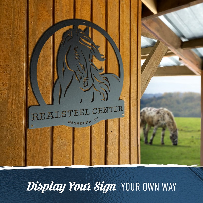 RealSteel Personalized Metal Wall Art - Custom Horse Head Design with Circular Frame - Business or Ranch Sign - Customizable Name & Location - Premium Laser-Cut Metal Sign