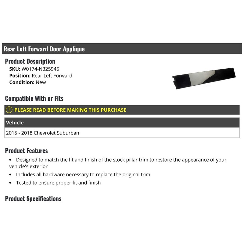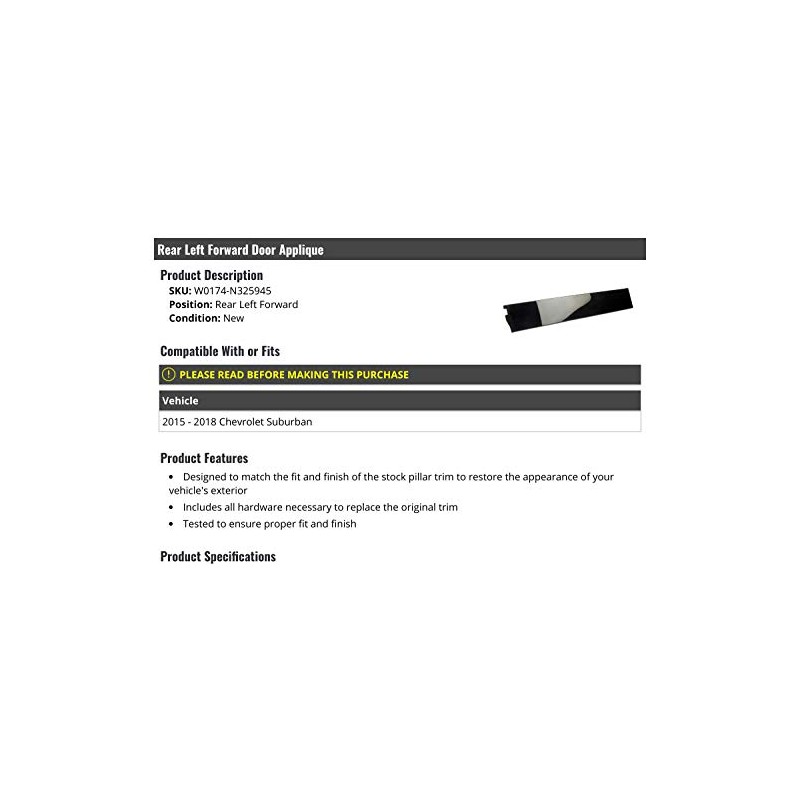 Rear Left Driver Side Forward Door Applique - Gloss Black - Compatible with 2015-2018 Chevy Suburban,W0174-N325945