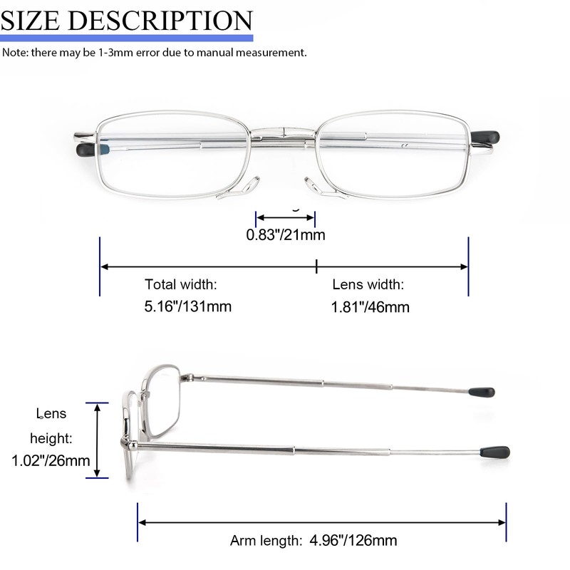 - 【ULTRA COMPACT DESIGN】Foldable bridge and telescoping temples for easy folding and compact storage.The frame and telescopic temples fold into tiny 1.65"x3.3" zipper bag.When you need to use reading glasses, pull out the temples to reach 4.96".