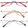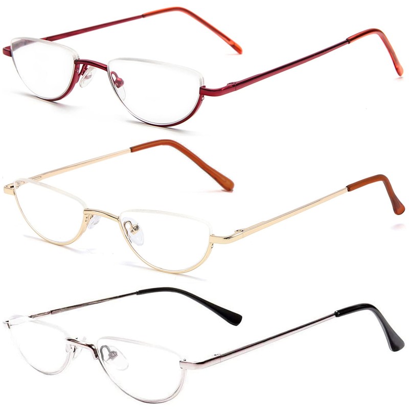 REAVEE 3 Pack Half Frame Retro Designer Alloy Reading Glasses Women Men Spring Hinge Half Moon Readers Stylish Slim Eyeglasses with Pouch,Red Gold Silver 1.0
