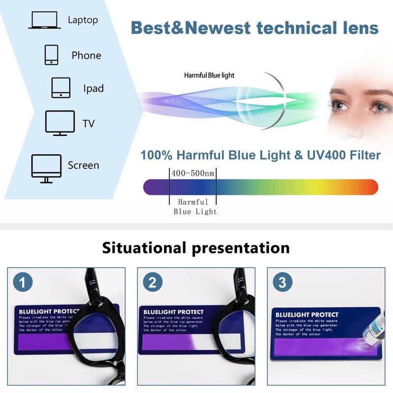 - Anti Blue Light Glasse - Blue light blocking lenses with UV400 protection block more than 95% of harmful blue light, reducing exposure to blue light from digital electronics and reading. Keep away from visual fatigue, headache, blurred vision and sleep disturbance.