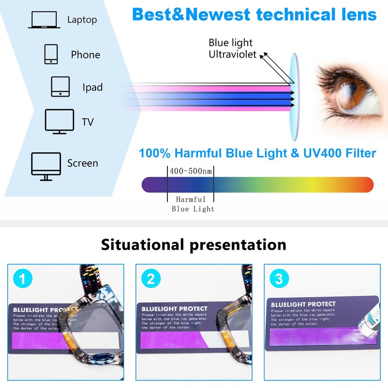 - Anti Blue Light Glasse - Blue light blocking lenses with UV400 protection block more than 95% of harmful blue light, reducing exposure to blue light from digital electronics and reading. Keep away from visual fatigue, headache, blurred vision and sleep disturbance.