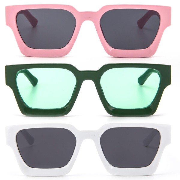 REAVEE 3 Pairs Oversized Square Stylish Sunglasses for Women UV400 Protection Men T2313 Pink Green and White