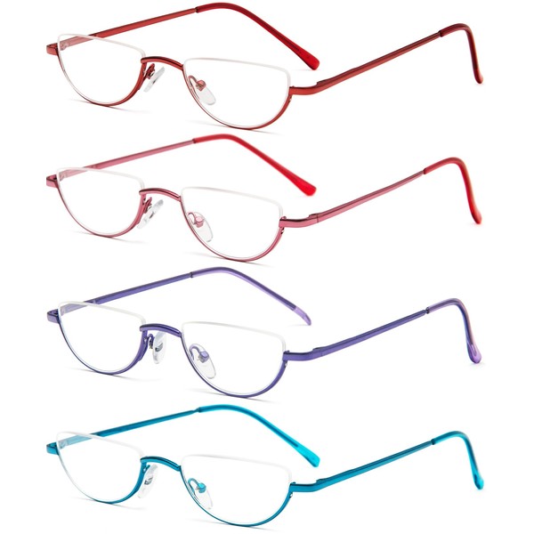 REAVEE 4 Pack Half Lens Reading Glasses for Women Retro Designer Alloy Spring Hinge Metal Frame Half Moon Readers with Pouch, Red Pink Blue Purple 1.25
