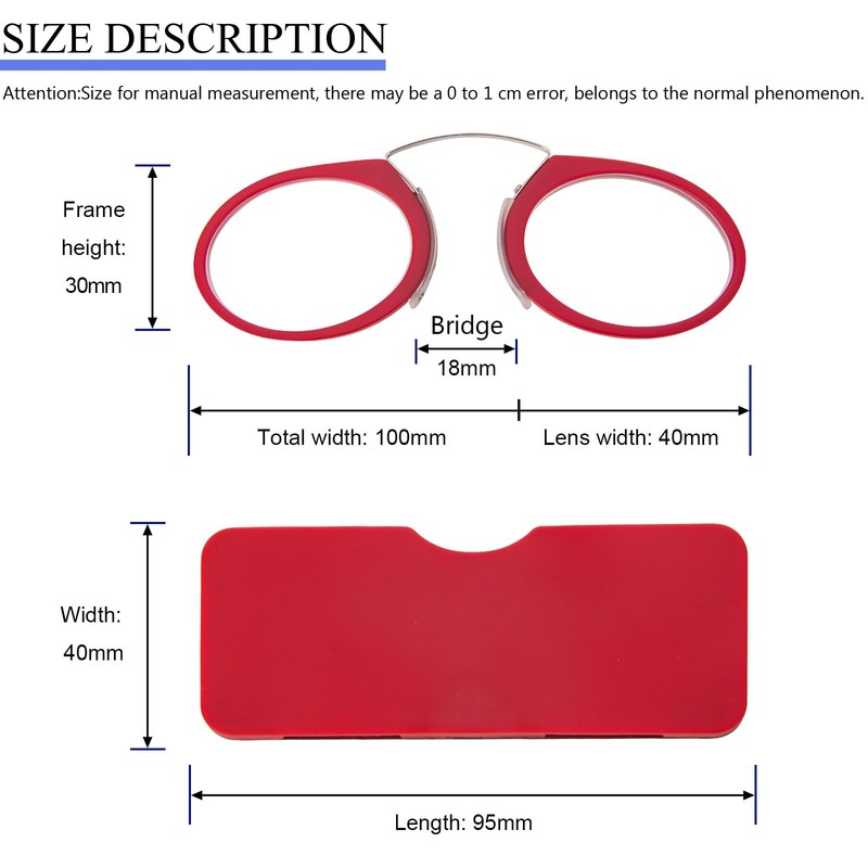• Small and lightweight: Lens width: 1.57", Lens height: 1.14", Bridge width: 0.71", Total Frame width: 3.94". Reader weight: 6g. Case Size: length 3.7", width: 1.53", thickness: 0.23". Case weight: 25g.