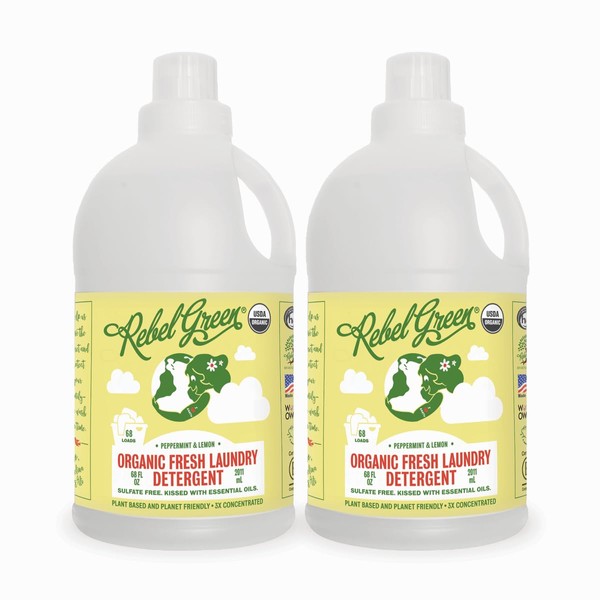 Rebel Green Organic Laundry Detergent - Natural Laundry Soap - Liquid Laundry Detergent with Dispenser Cup - Gentle Laundry Detergent - Fresh Peppermint & Lemon Scent - (68 Load Bottles, 2 Pack)
