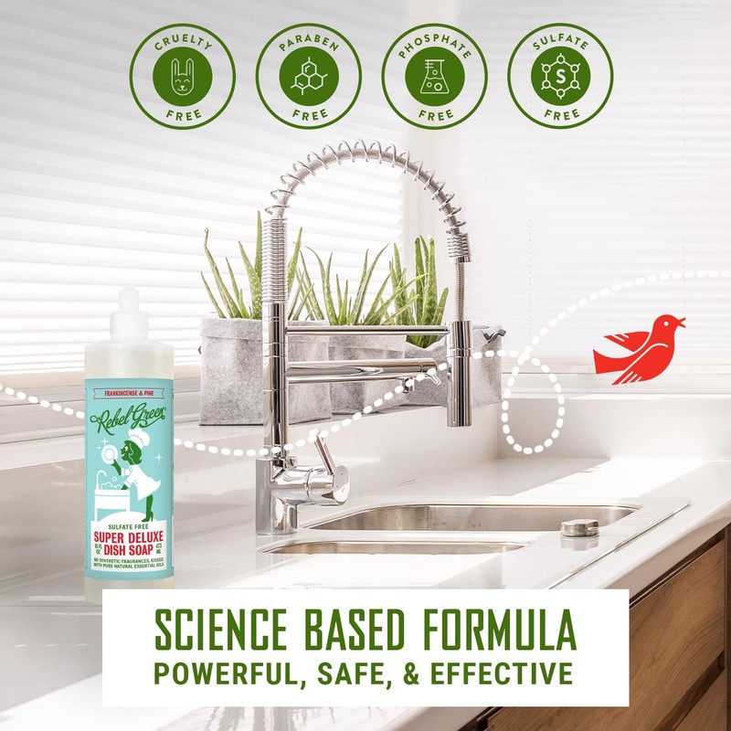 - FRESH & CLEAN: Kissed with pure essential oils, Rebel Green's food grade natural kitchen soap provides an effective dish wash that cleans both hands and dishes gently and effectively.
