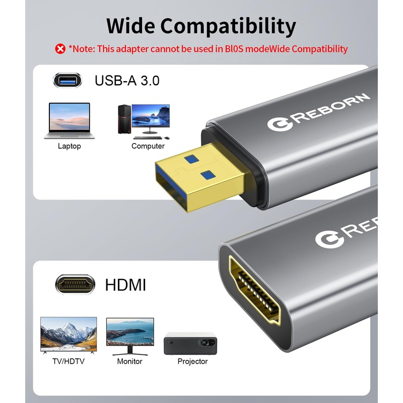 • Reborn USB to HDMI adapter : The Reborn USB to HDMI adapter, a powerful device, converts USB to HDMI, facilitating connections to HDMI displays. Vital for laptop screen output and multimedia, its compactness ensures convenient carrying and instant connection.