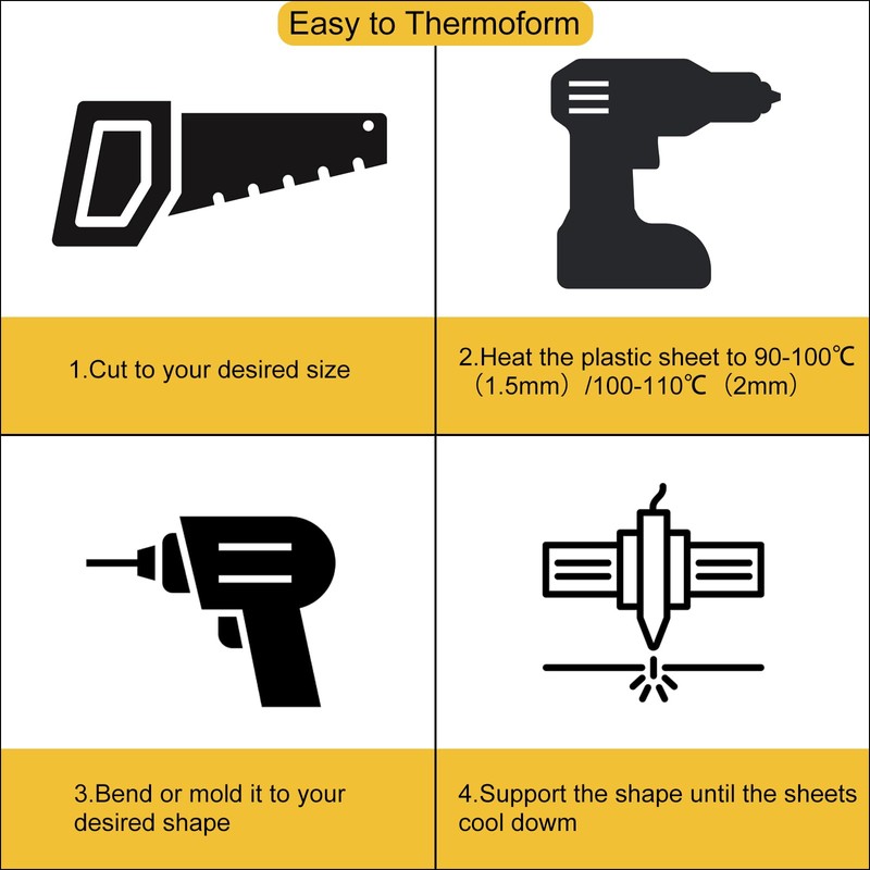 - Easy to intall:1.Cut to your desired size.2.Heat the plastic sheet to 90-100℃(1.5mm)/100-110℃(2mm).3.Bend it to your desired shape.4.Support the shape until the sheets cools to its lowest temperature.