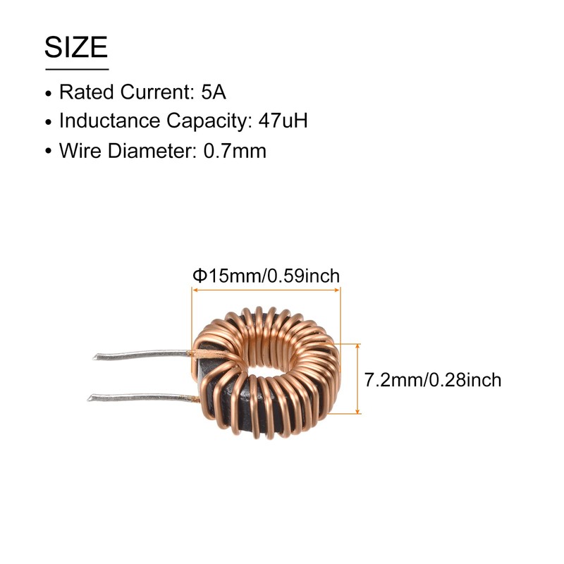 - 2-[Product Size]: Induction Capacity: 47uH; Rated Current: 5A; Outer Diameter: 15mm; Cable Diameter: 0.7mm; Thickness: 7.2mm; Pin Length: 10mm.