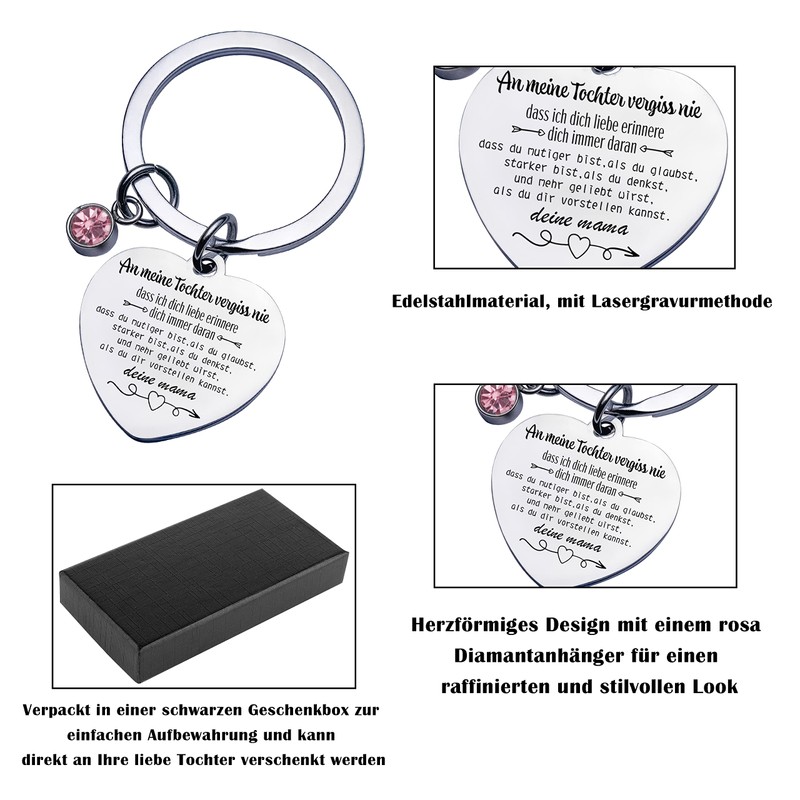- Keyring with engraving: the key pendant with engraving is made of heart-shaped look + pink diamond pendant, with laser engraving method, the words are written and engraved as a gift from mother to daughter to express love for daughter.