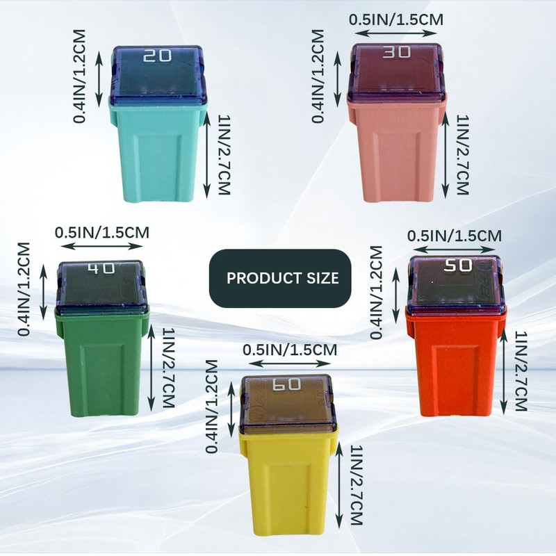 - Products include: The car fuse combination set includes 10 square low-profile fuses, with blue 20A×2, pink 30A×2, green 40A×2, red 50A×2, and yellow 60A×2, the quantity is sufficient to meet the needs of daily use and replacement, making a very worthwhile car accessory to purchase