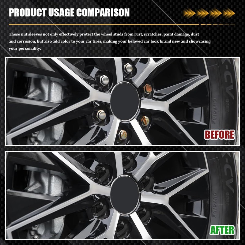 - Protection and tidiness: These lug nut caps bid farewell to messy peeling paint and rusty nuts, while protecting your nuts from corrosion and dust, and can also add color to your car tires