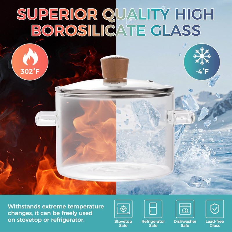 - Designed to withstand temperatures ranging from 0H to 400H, this glass pot for stove top is highly shock-resistant and suitable for gas, as well as ovens, microwaves, and refrigerators. Its versatility makes it ideal for cooking, baking, reheating, or storing leftovers in a glass saucepan or simmer pot for stove potpourri.