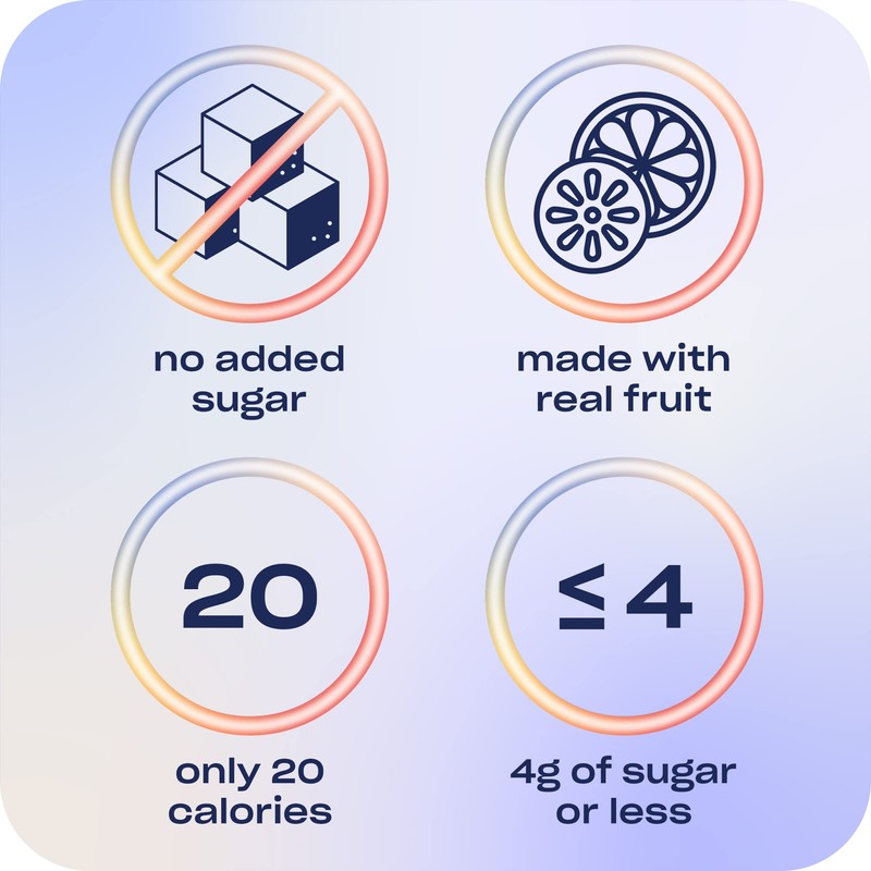 - LOW CAL: Zero added sugar, no fake stuff. Only 20 calories and 4g or less of sugar from fruit juice.