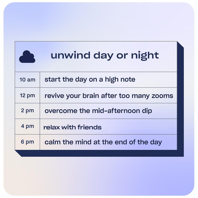 - RELAX AND UNWIND: A magnesium and adaptogen-infused sparkling water to help you unwind.