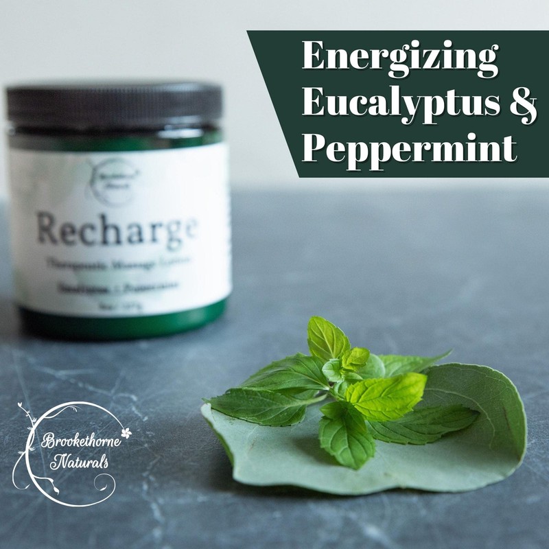 - Great for Aromatherapy! Recharge scented massage lotion features our peppermint & eucalyptus essential oil blend which create an energizing & refreshing aroma while helping to soothe muscle aches & stiffness.