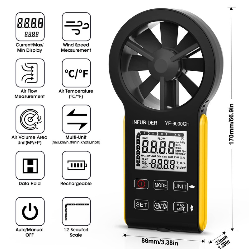 Rechargeable Anemometer Handheld, Digital Smart Touch Wind Speed Meter,Portable CFM Wind Speed Gauge for Air Flow Velocity Temperature Measurement,HVAC Wind Anemometer Outdoor(INFURIDER YF-6000GH)