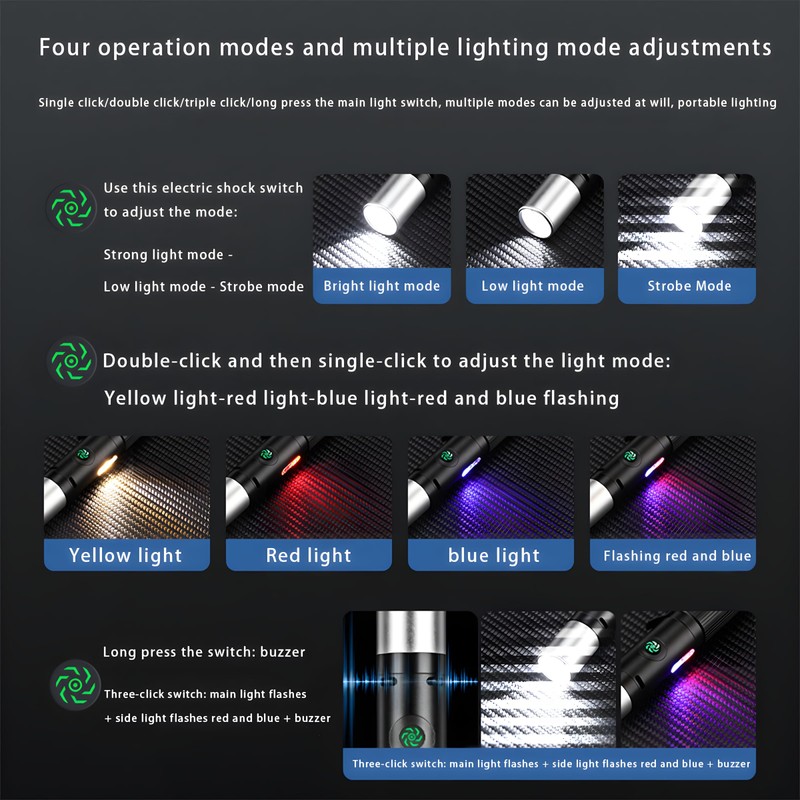 - 【Multi-Color Side Lights for Work and Safety】 This versatile small flashlight includes yellow, red, blue, and red-blue strobe side lights, ideal for night repairs, roadside alerts, or visibility in low-light conditions. Designed for both professional and emergency use.