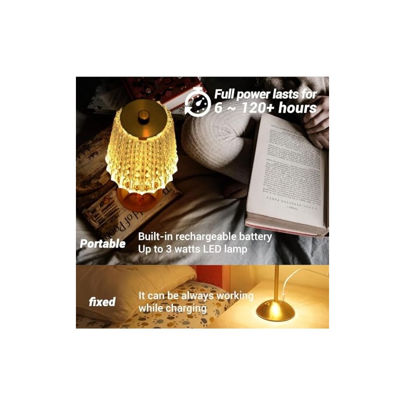 Rechargeable LED Table Lamp, Crystal Glass Shade, 3W, USB-C, Gold Metal Base, 11.8-inch