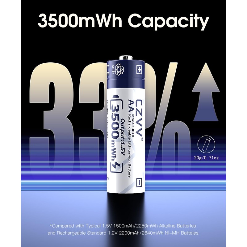 - What You Get: A Set of CZVV Rechargeable AA LOT Combo. Included CZVV 3500mWh/2333mAh 1.5V 'AA Classic 2' Batteries (4 Count Pack),Batteries Storage Box *1, CZVV Industry-leading Exclusive 3-year Warranty, Lifetime Technical Support and Friendly Customer Service.