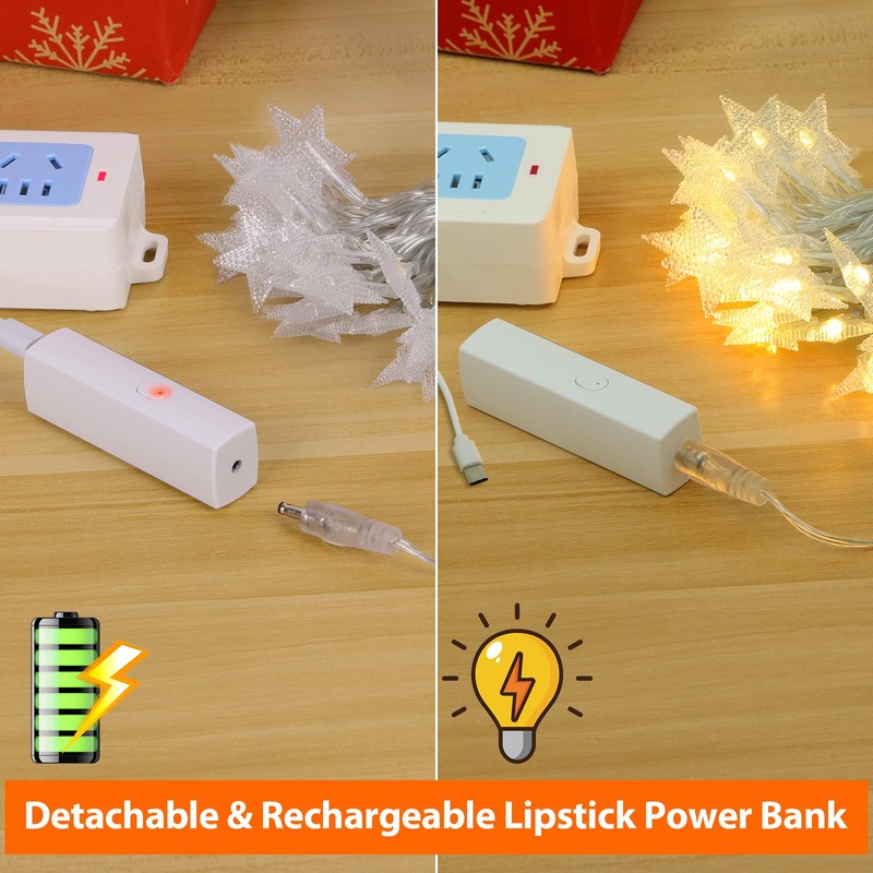 - 【Bring the Stars Indoors】 Illuminate your space with 17FT of rechargeable star lights, featuring 50 delicate LED stars (1.3 inches each) that shimmer with a warm, inviting glow. Built with durable, waterproof construction, these lights are perfect for bedrooms, tents, porches, or holiday décor—adding a touch of cozy magic to every setting. (Note: rechargeable power bank is not waterproof)
