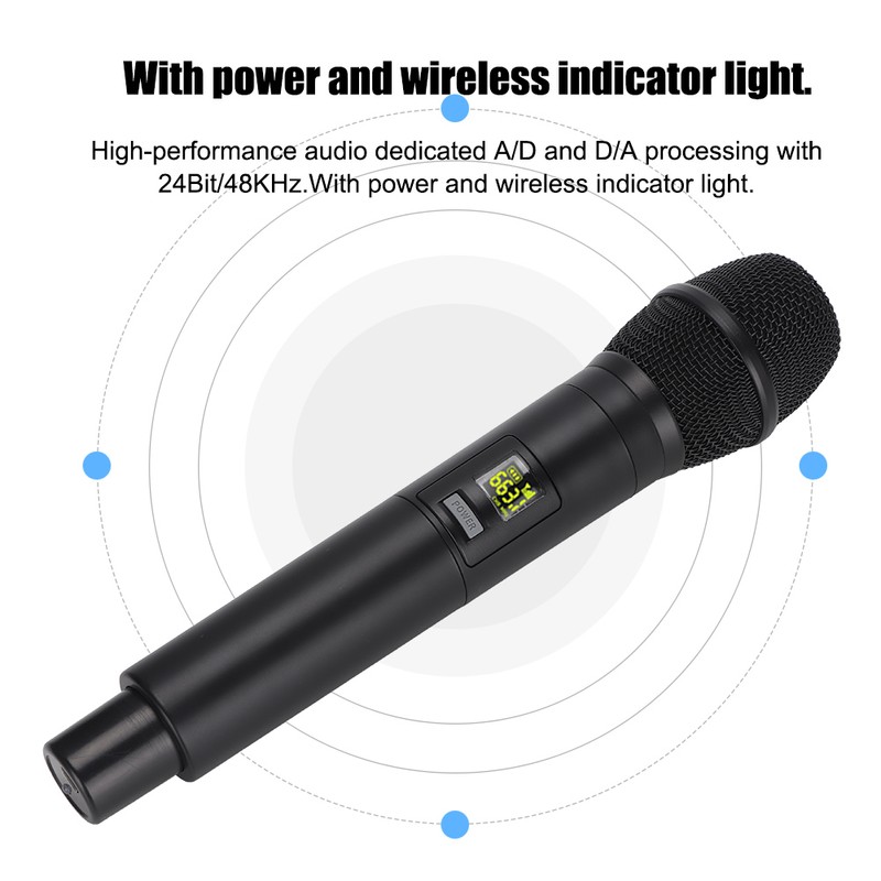 1、High-performance audio dedicated A/D and D/A processing with 24Bit/48KHz. 2、With automatic mute and impact elimination circuit to avoid the impact and noise of the switch on/off. 3、The effective distance of wireless transmission is 20-50 meters. 4、Multiple devices can be used at the same time, without interference and frequency. 5、With power and wireless indicator light.