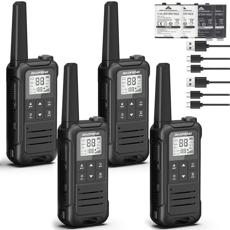 - 【What you get】Package contains (walkie talkie, belt clip, hand strap,battery ) X 4 and user manual X2, 2 in 1 Type-C Charger X2. Easy to operate, suitable for novices, and provide technical guidance. All day customer service replies to ensure your purchase enjoyment.