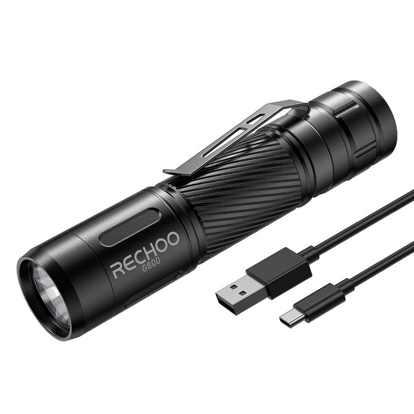 - Bright Small Rechargeable Flashlights: RECHOO G800 rechargeable flashlights high lumens feature an upgraded LED chip providing 1000 lumens and 3 lighting modes (high, medium, strobe), perfect for daily use or emergencies; Convenient mode switching and all-in-one design eliminate frequent battery replacements;Compact for everyday carry;
