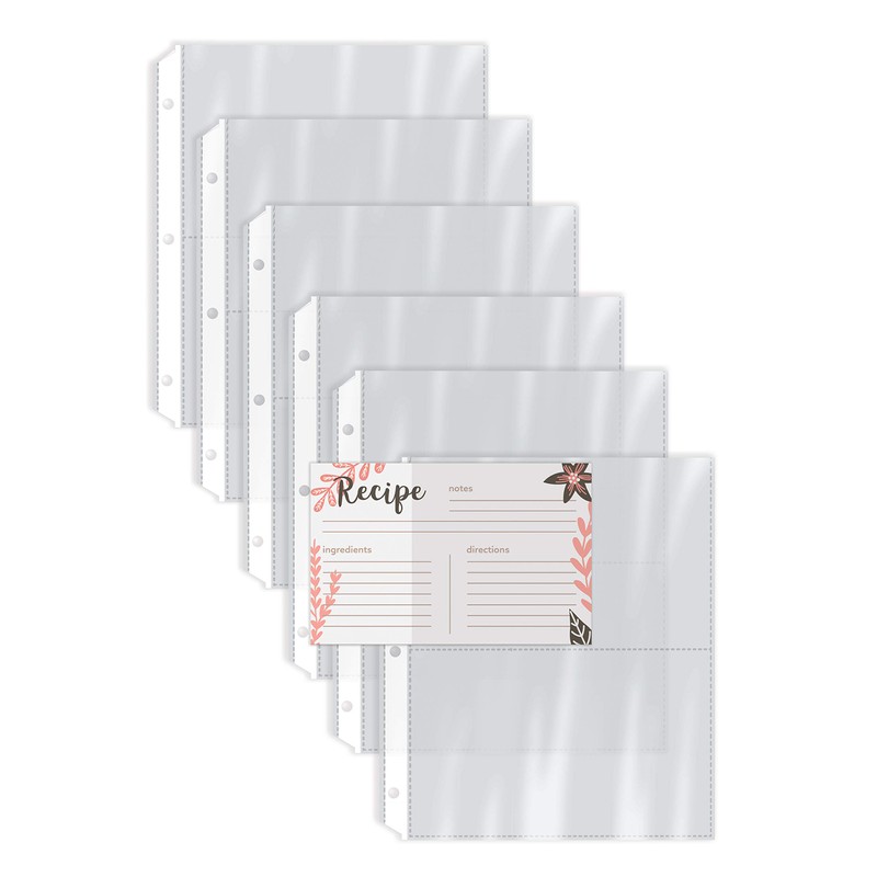 50-Ct. clear recipe card protector refill sheets for recipe binders and half-sheet mini binders hold up to four 4" x 6" recipe cards per sheet. Archival safe, acid-free and side loading at margin for easy page insertion and security. Durable, nonstick and non-glare. 3-Hole punched margins fit most mini 3-ring binders and have reinforced edges for added durability. Splatter-proof protection of your prized recipes just got easier!