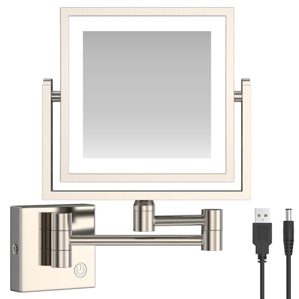 - An Exquisite Indoor Arts Ware: The lighted make up mirror wall mounted has an 8-inch square mirror. The silver-plated mirror image is clear and true. The touch switch on the base will not break the overall beauty of the mirror. The wall magnifying mirror bracket is made of brass and brushed nickel finish, which is exquisite and high-grade arts ware.