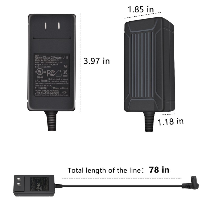 Input range of AC 100-240V, 50/60Hz, 1.5A, and provides a stable output of DC 29.0V, 2.0A, 58.0W.