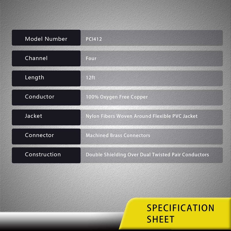 • Premium 4-Channel RCA Interconnect Cable, Length 12ft, Providing Crystal Clear Stereo Sound for Your Amplifier. Utilizing 99.99% Oxygen Free Multi-Strand Copper Wire Construction