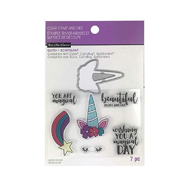 Take some inspiration from this unicorn-themed stamp and die-cut set and create some adorable cards for your friends and family. Use it to cut, stamp and emboss a variety of DIY papercraft projects. Details: Clear 3.87" x 4" Includes 7 stamps and 1 die-cut Silicone and aluminum