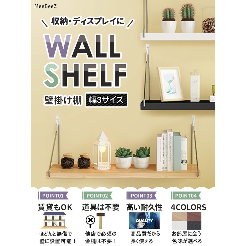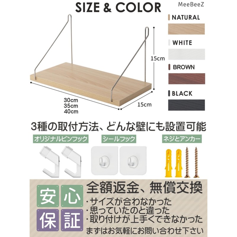 - Product specifications: Size: Width 11.8 inches (30 cm) or 13.8 inches (40 cm) x Depth 5.9 inches (15 cm) x Height 5.9 inches (15 cm); Color: Natural/White/Brown/Black; Set contents: Wall shelf x 1, mounting screws x 2, gypsum board anchors x 2, pin hooks x 2, Japanese instruction manual (English language not guaranteed); Material: Wood, Stainless steel; Load capacity: 6.6.6 - 3 - 2 lbs (3 lbs (3 kg). Brand: MeeBeeZ)