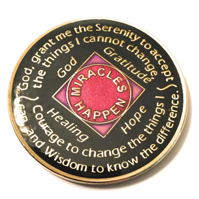 This NEW Tri-colored Enamel medallion features the time honored program phrases "Out of the Ashes of Addiction Comes Recovery and Growth", "Just for Today" and the words Serenity and Peace. On the reverse side is the Serenity Prayer with the program words "God, Gratitude, Hope and Healing" and in the center "Miracles Happen." 24KT gold plating.