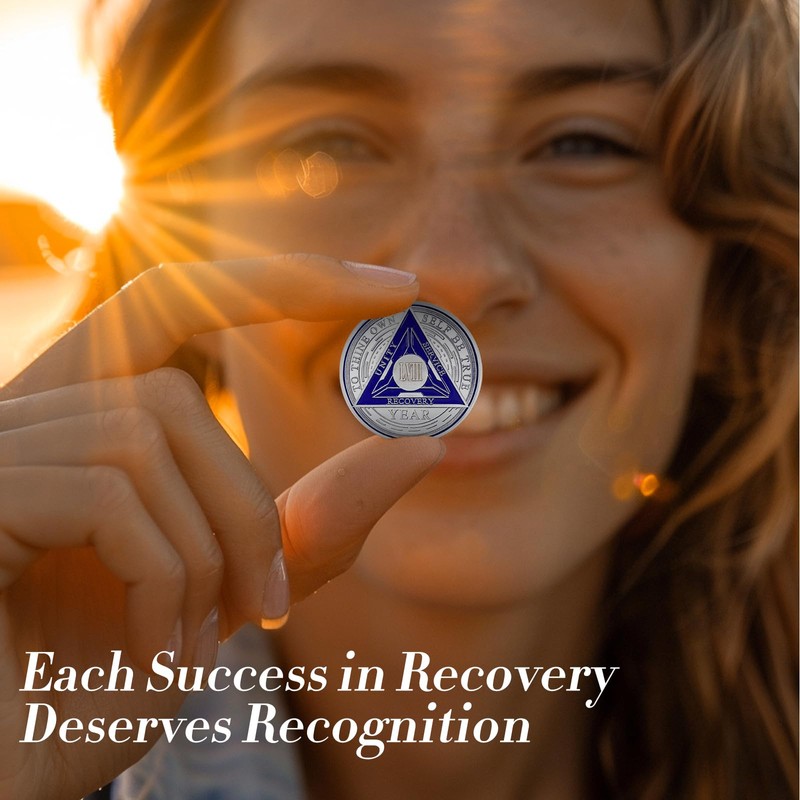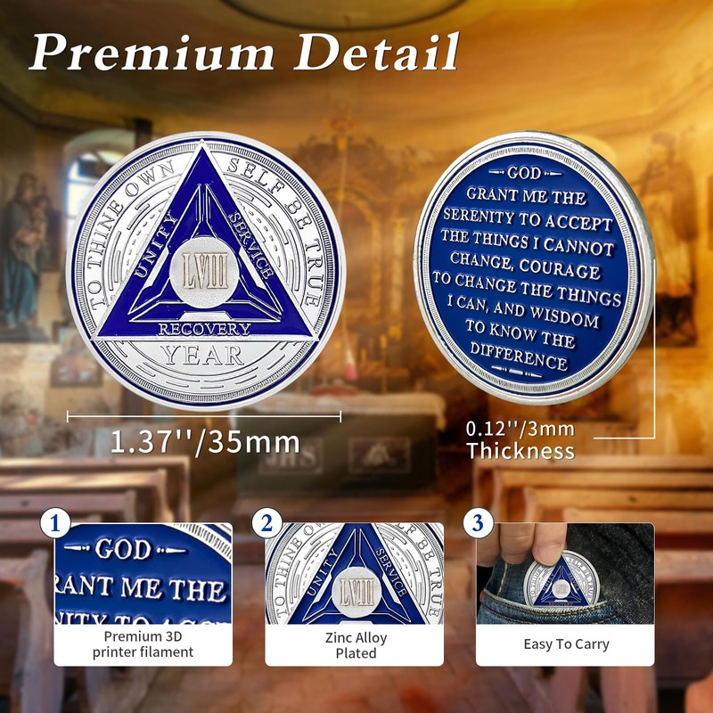 - 🎨Double-Sided Design: The front aa medallions showcase a blue triangle, embodying sober's core principles: Unity, Service, and Recovery, symbolizing support and camaraderie crucial on the journey to sobriety. On the back, the Serenity Prayer is engraved, serving as a potent reminder of the values of acceptance, courage, and wisdom that are crucial for recovery and personal growth. This symbolizes the transformative journey toward living clean life.