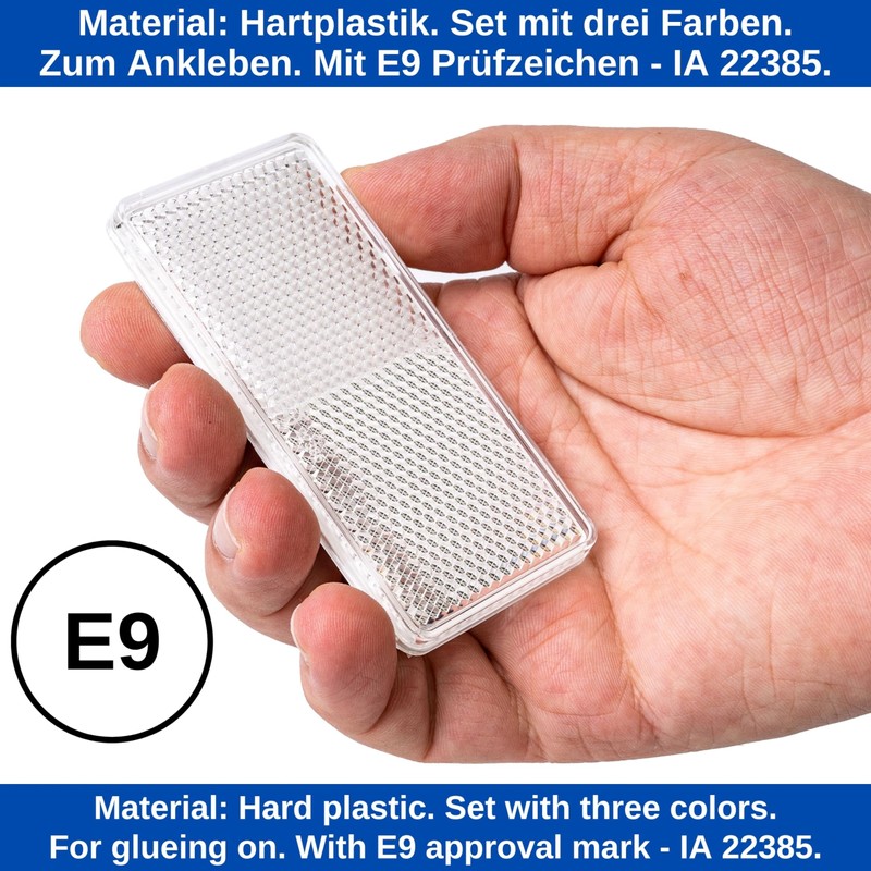 - Box contents: 8 x square-rounded reflectors set with 4 x orange, 2 x white and 2 x red, 9.4 x 4.4 cm, for sticking to smooth surfaces.