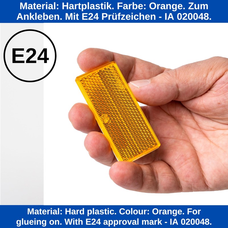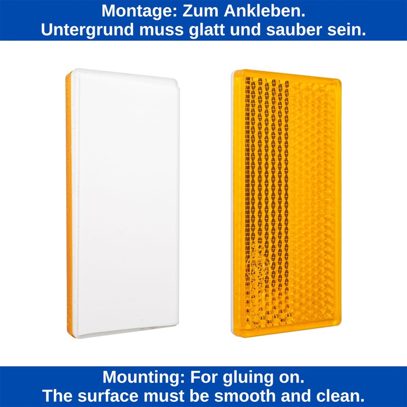 Rectangular reflectors to stick on, 4 pack, orange, 70 x 30 x 7 mm dimension, with E-approval mark, rectangular reflectors for trailers, motorhomes, cat's eye left right